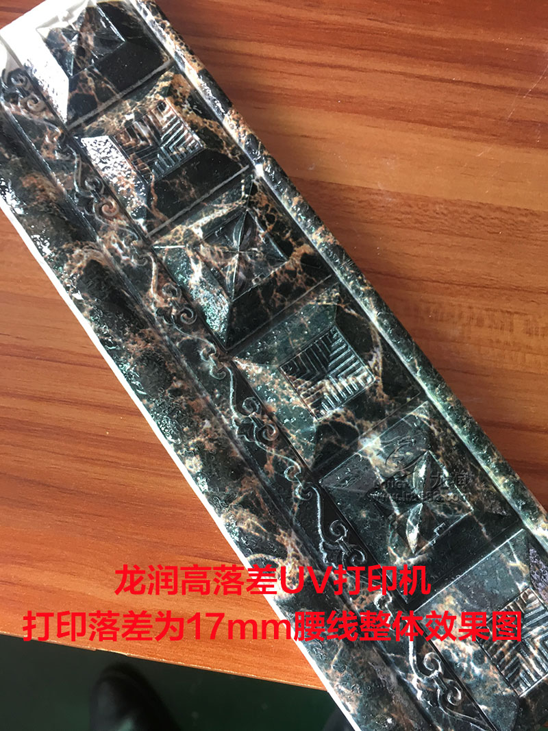 我們隨機(jī)抽取了一塊樣品進(jìn)行打印,打印出來后整體效果還算滿意,客戶也能認(rèn)可,然而我們那尺子測量該腰線的落差高度,才知道該腰線落差高度已經(jīng)達(dá)到了17mm,比我們之前測試的15mm樣品還要高2mm,然而看細(xì)節(jié),發(fā)虛并不嚴(yán)重,也沒有嚴(yán)重飛墨的情況出現(xiàn),整體效果已經(jīng)是能達(dá)到客戶的需求。
