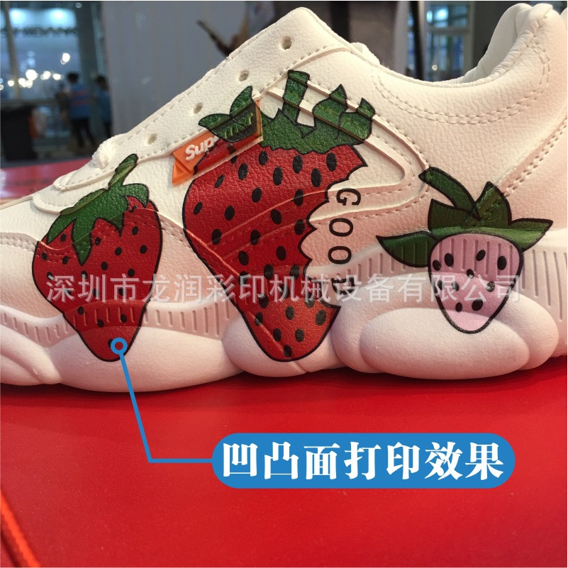 龍潤(rùn)LR-2513 uv打印機(jī)實(shí)現(xiàn)從2.5毫米打印距離到2.5厘米打印距離的,直接打印高弧度,實(shí)現(xiàn)uv打印高弧面,uv打印異形,uv打印鞋面,uv打印凹凸面,uv打印玩具等高落差產(chǎn)品,無需制版,直接打印。2513UV高落差平板噴墨打印機(jī)是針對(duì)鞋子/鞋材行業(yè)的專用機(jī)型,其有高落差、高噴射、打印精度高、質(zhì)量好、色彩鮮艷、打印速度快、圖案清晰亮麗、不掉色等特點(diǎn)。打印落差25mm不飛墨,打印方便,無需制版,只要有圖片,連接一臺(tái)電腦就可以直接在成品鞋或者鞋材上面印刷自己想要的3D圖案。因?yàn)樵O(shè)備針對(duì)不同客戶,不同行業(yè),所以在機(jī)器配置和機(jī)器大小選購方面存在差異,價(jià)格也高低不一,客戶在購買機(jī)器前務(wù)必要咨詢銷售人員,我們才能推薦適合您的機(jī)器。